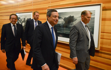 圖為德拉吉(前左)前往會(huì)后的新聞發(fā)布會(huì)。