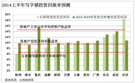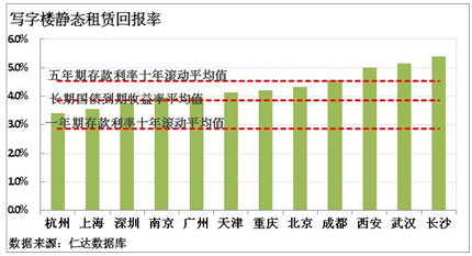 據(jù)上圖,長沙、重慶寫字樓投資回報率高于房地產(chǎn)上市公司收益率,高回報往往是以高風險為前提的,過高的回報率意味著未來房地產(chǎn)市場逆轉的高風險。因此,當房產(chǎn)投資回報率高于房地產(chǎn)信托和上市公司收益率時,意味著投資決策時要謹慎應對。