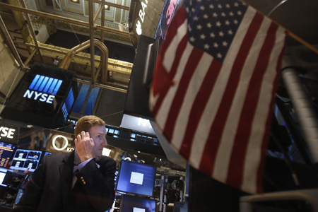 受外圍市場上漲提振,紐約股市三大股指9日上漲,其中道瓊斯工業(yè)平均指數(shù)和標普500指數(shù)再創(chuàng)新高。截至當天收盤,道瓊斯工業(yè)平均指數(shù)比前一個交易日漲18.82點,收于16943.10點,漲幅為0.11%。標準普爾500種股票指數(shù)漲1.83點,收于1951.27點,漲幅為0.09%。圖為一名交易員9日在美國紐約證券交易所內(nèi)工作。