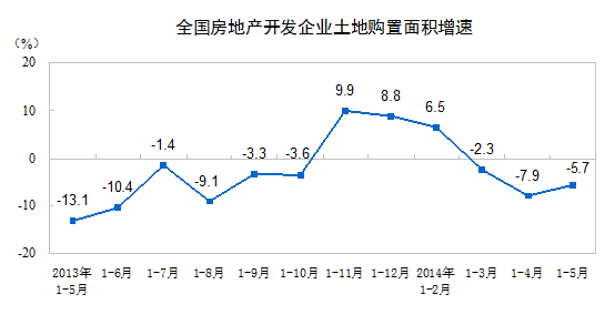1-5月份,房地產(chǎn)開(kāi)發(fā)企業(yè)土地購(gòu)置面積11090萬(wàn)平方米,同比下降5.7%,降幅比1-4月份收窄2.2個(gè)百分點(diǎn);土地成交價(jià)款2954億元,增長(zhǎng)8.7%,增速回落0.9個(gè)百分點(diǎn)。