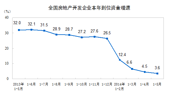 2014年1-5月份,全國(guó)房地產(chǎn)開(kāi)發(fā)投資30739億元,同比名義增長(zhǎng)14.7%,增速比1-4月份回落1.7個(gè)百分點(diǎn)。其中,住宅投資21043億元,增長(zhǎng)14.6%,增速回落2個(gè)百分點(diǎn),占房地產(chǎn)開(kāi)發(fā)投資的比重為68.5%。