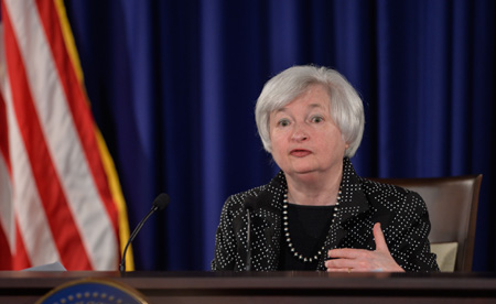 美國聯(lián)邦儲備委員會18日宣布,從7月起將月度資產(chǎn)購買規(guī)模從450億美元削減至350億美元,并承諾繼續(xù)保持貨幣政策寬松。同時,受第一季度嚴寒天氣影響,美聯(lián)儲將2014年美國經(jīng)濟增長預(yù)期從此前的2.8%至3.0%下調(diào)為2.1%至2.3%。對明后兩年的增長前景保持樂觀,但是對長期前景表示擔(dān)憂。 圖為美聯(lián)儲主席耶倫當日出席在美國首都華盛頓召開的貨幣政策例會新聞發(fā)布會。