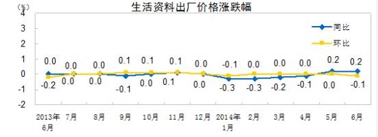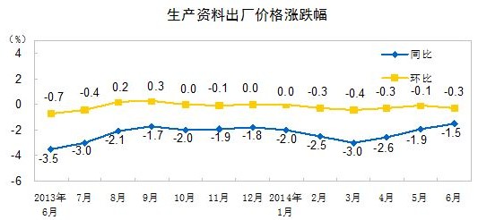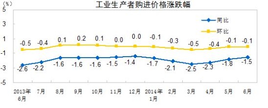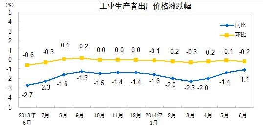 2014年6月份,全國(guó)工業(yè)生產(chǎn)者出廠價(jià)格同比下降1.1%,環(huán)比下降0.2%。工業(yè)生產(chǎn)者購(gòu)進(jìn)價(jià)格同比下降1.5%,環(huán)比下降0.1%。上半年,工業(yè)生產(chǎn)者出廠價(jià)格同比下降1.8%,工業(yè)生產(chǎn)者購(gòu)進(jìn)價(jià)格同比下降2.0%。