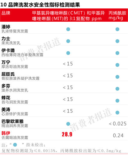 第三方權(quán)威檢測(cè)機(jī)構(gòu)檢測(cè)結(jié)果發(fā)現(xiàn),在安全性方面,韓伊洗發(fā)水當(dāng)中的兩種防腐劑——甲基異噻唑啉酮(MIT)和甲基氯異噻唑啉酮(CMIT)復(fù)配物含量為28.9ug/g,超標(biāo)近兩倍,可能易引發(fā)過敏;同時(shí)并檢出可能致癌物丙烯酰胺,疑似添加了業(yè)內(nèi)早已淘汰的增稠劑。