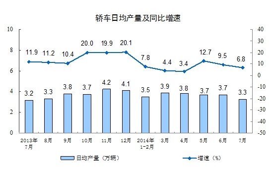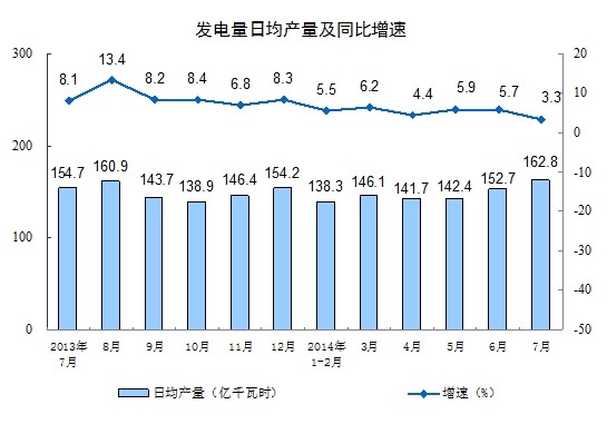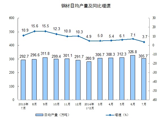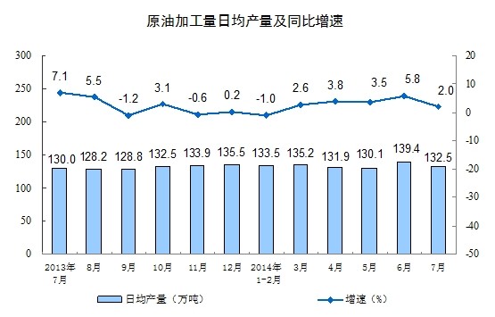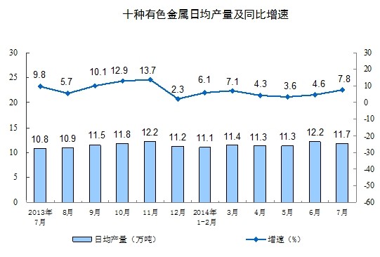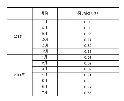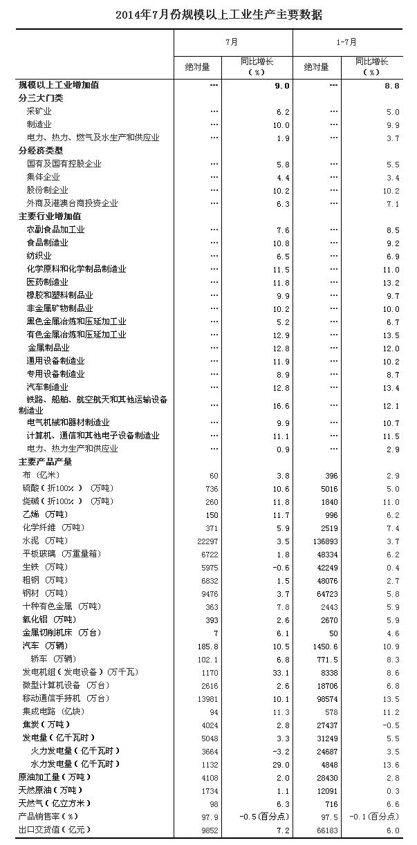 2014年7月份,規(guī)模以上工業(yè)增加值同比實(shí)際增長9.0%(以下增加值增速均為扣除價(jià)格因素的實(shí)際增長率),比6月份回落0.2個(gè)百分點(diǎn)。從環(huán)比看,7月份比上月增長0.68%。1-7月份,規(guī)模以上工業(yè)增加值同比增長8.8%。