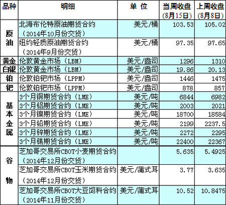 國際大宗商品期貨價(jià)格明細(xì)表[2014-8-18]