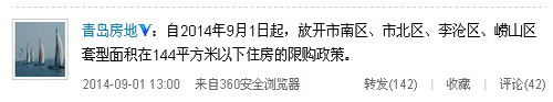 據(jù)青島市國土資源局和房屋管理局官方微博消息,自2014年9月1日起,放開市南區(qū)、市北區(qū)、李滄區(qū)、嶗山區(qū)套型面積在144平方米以下住房的限購政策。