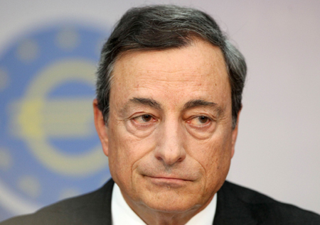 歐洲央行4日舉行例行貨幣政策會議,決定自10日起將所有利率降低10個基點,歐元區(qū)基準利率降至0.05%。根據(jù)公告,主要再融資利率調(diào)降至0.05%,隔夜存款利率降至負0.2%,隔夜貸款利率調(diào)低至0.3%。 圖為歐洲央行行長德拉吉當天在記者會上發(fā)表聲明。