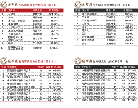 從分析師研究能力來看,國聯(lián)證券分析師馬寶德推薦的個(gè)股中材節(jié)能在20日短線評(píng)測中漲幅高達(dá)331.08%,在8月金羅盤分析師研究能力排行中一舉奪魁。而申銀萬國證券分析師推薦的個(gè)股群興玩具,在20日短線評(píng)測中錄得的最高漲幅為-13.15%,成績遠(yuǎn)遠(yuǎn)差于其他股票的表現(xiàn),最終位列榜單倒數(shù)第一。