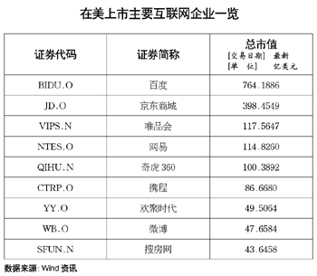 實際上,除了阿里巴巴之外,近年來,大量的互聯(lián)網(wǎng)企業(yè)在海外相繼上市。美國當?shù)貢r間5月22日,京東正式在納斯達克掛牌上市,股票代碼為“JD”,截至記者發(fā)稿時,京東的市值已經(jīng)達到了398億美元。WIND統(tǒng)計數(shù)據(jù)顯示,截至目前,在港上市的騰訊控股市值為11555億港元,在美上市的百度和奇虎360的市值則分別為764億美元和100億美元。按照目前的匯率計算,僅上述4家互聯(lián)網(wǎng)企業(yè),其市值就已經(jīng)達到1.69萬億元人民幣。