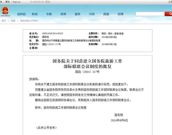 9月15日晚,中國政府網(wǎng)公布《國務(wù)院關(guān)于同意建立國務(wù)院旅游工作部際聯(lián)席會議制度的批復(fù)》(下稱《批復(fù)》):“同意建立由國務(wù)院領(lǐng)導(dǎo)同志牽頭負責(zé)的國務(wù)院旅游工作部際聯(lián)席會議制度。聯(lián)席會議不刻制印章,不正式行文,請按照國務(wù)院有關(guān)文件精神認真組織開展工作!