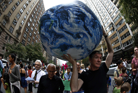 當(dāng)?shù)貢r間21日,美國紐約民眾舉行大游行,呼吁關(guān)注氣候變化。當(dāng)天的游行是紐約“氣候周”活動的一部分,也是為了呼應(yīng)將于23日在紐約舉行的聯(lián)合國氣候峰會。據(jù)主辦方統(tǒng)計,當(dāng)天參與游行人數(shù)超過30萬。 圖為一名男子帶著地球模型參加游行。