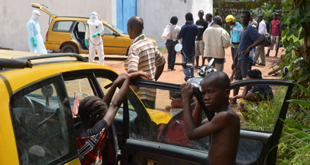 圖為9月23日,在利比里亞蒙羅維亞,一名患者乘坐出租車來到新建成的埃博拉治療中心“小島診所”后,工作人員給出租車消毒。