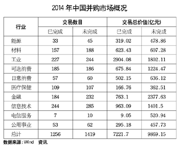 Wind統(tǒng)計(jì)數(shù)據(jù)則顯示,僅2014年以來(lái),中國(guó)公司已經(jīng)完成的并購(gòu)交易數(shù)目就達(dá)到1256宗,交易總價(jià)值達(dá)到7222億元;未完成的并購(gòu)交易數(shù)目則達(dá)到1419宗,涉及金額更是高達(dá)9869億元,合計(jì)達(dá)到1.7萬(wàn)億元之巨。相比之下,在重組相當(dāng)活躍的2013年,全年并購(gòu)交易也只有1296家次,金額合計(jì)6330億元。