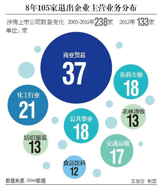 家,而到了2012年年報中,這一數(shù)值降到了133家,也即8年間,有105家,約44.1%的涉房上市企業(yè)選擇了“脫離房地產(chǎn)”。