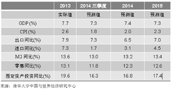 清華大學(xué)中國與世界經(jīng)濟研究中心12日預(yù)測,2014年中國國內(nèi)生產(chǎn)總值(GDP)同比增長7.4%,2015年增長7.3%。而在10日,中國社會科學(xué)院發(fā)布的預(yù)測結(jié)果為:今年增長7.3%,明年為7%。多位學(xué)者和政府人士建議,將明年GDP增長預(yù)期目標(biāo)定在7%,以便讓政府的宏觀調(diào)控更具主動性。