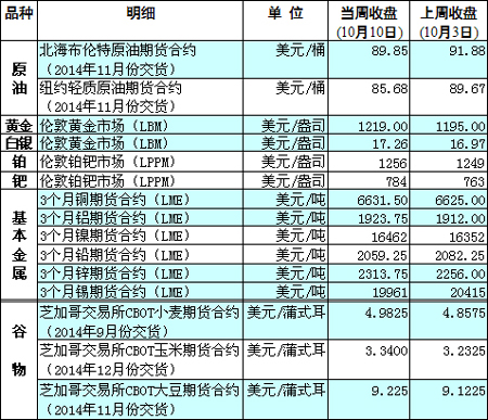 國際大宗商品期貨價(jià)格明細(xì)表[2014-10-13]