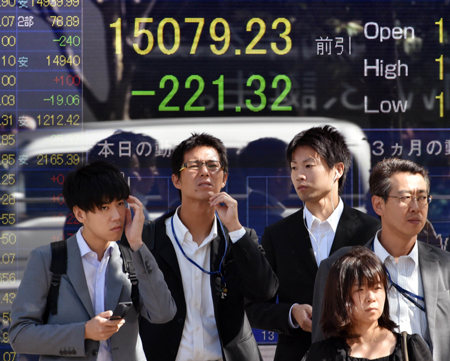 在隔夜美國(guó)股市大幅收跌和美元匯率走軟等多重利空因素拖累下,14日東京股市低開(kāi)低走,日經(jīng)225種股票平均價(jià)格指數(shù)收盤(pán)時(shí)比前一個(gè)交易日大跌2.38%,失守15000點(diǎn)關(guān)口。 圖為當(dāng)日東京行人經(jīng)過(guò)顯示股價(jià)的屏幕前。