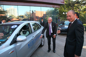 圖3:江淮汽車獨家贊助了“2014第三次工業(yè)革命高峰論壇”,并在論壇期間舉行了純電動轎車試乘試駕活動。圖為安徽江淮汽車股份有限公司總經(jīng)理項興初(右一)在新華社現(xiàn)場,向美國著名趨勢學家里夫金先生介紹論壇專用的江淮愛意為(iEV)純電動轎車。王皓然/攝 |