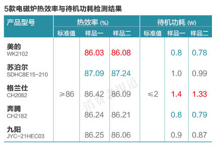 除了使用安全外,省電、高效同樣是消費者在選購時的重要參考。在本刊此次選擇的5款受測產(chǎn)品中,蘇泊爾電磁爐的熱效率較高,而格蘭仕待機功耗較高。