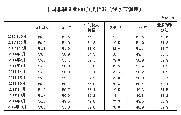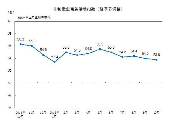 2014年10月,中國(guó)非制造業(yè)商務(wù)活動(dòng)指數(shù)為53.8%,比上月回落0.2個(gè)百分點(diǎn),高于榮枯線3.8個(gè)百分點(diǎn),表明我國(guó)非制造業(yè)繼續(xù)保持?jǐn)U張態(tài)勢(shì)。