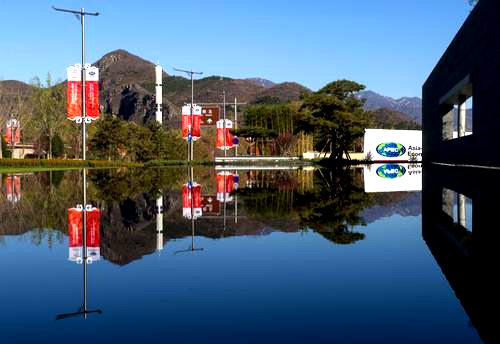 11月3日,APEC彩旗和標識倒映在雁棲湖新聞中心外的水面上。