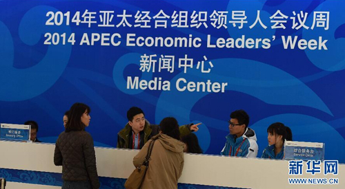 11月4日,國(guó)家會(huì)議中心新聞中心綜合服務(wù)臺(tái)的工作人員在提供咨詢服務(wù)。當(dāng)日,2014年亞太經(jīng)合組織(APEC)領(lǐng)導(dǎo)人會(huì)議周兩個(gè)新聞中心之一的國(guó)家會(huì)議中心新聞中心正式啟用向媒體記者開(kāi)放。據(jù)介紹,新聞中心總面積約11000平方米,全面覆蓋免費(fèi)無(wú)線網(wǎng)絡(luò),將為媒體提供視頻、文字、圖片綜合素材和專業(yè)的廣播電視服務(wù)。新華社記者
