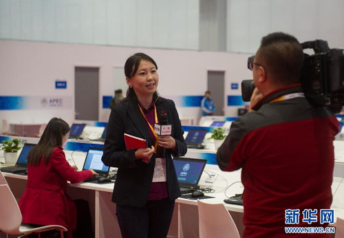 11月4日,國家會議中心新聞中心綜合服務(wù)臺的工作人員在提供咨詢服務(wù)。當(dāng)日,2014年亞太經(jīng)合組織(APEC)領(lǐng)導(dǎo)人會議周兩個新聞中心之一的國家會議中心新聞中心正式啟用向媒體記者開放。據(jù)介紹,新聞中心總面積約11000平方米,全面覆蓋免費無線網(wǎng)絡(luò),將為媒體提供視頻、文字、圖片綜合素材和專業(yè)的廣播電視服務(wù)。新華社記者 陳曄華/攝