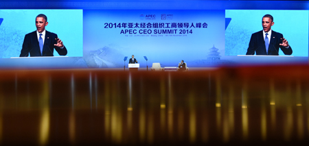 11月10日,美國總統(tǒng)奧巴馬在北京國家會議中心舉行的2014年亞太經(jīng)合組織(APEC)工商領(lǐng)導人峰會上發(fā)表《促進亞太繁榮:經(jīng)濟發(fā)展優(yōu)先目標》主旨發(fā)言。