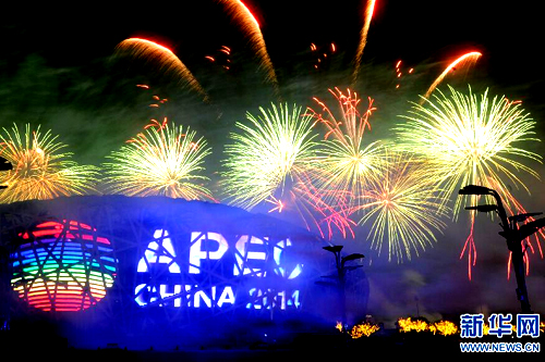 11月10日,北京在奧林匹克公園舉行焰火表演。亞太經(jīng)合組織(APEC)第二十二次領(lǐng)導(dǎo)人非正式會議11月10日至11日在北京舉行。 新華社記者 羅曉光/攝
