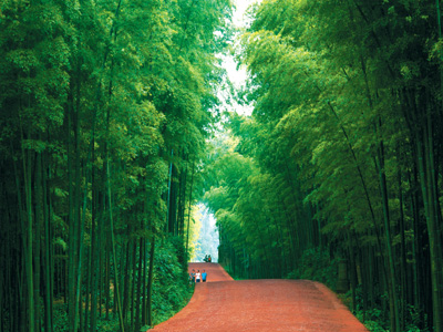 翡翠長(zhǎng)廊位于竹海竹林深處,是蜀南竹海的又一勝景。翡翠長(zhǎng)廊的路面是由“色如渥丹、燦若明霞”的當(dāng)?shù)靥烊患t色砂石鋪成。兩旁密集的老竹新篁拱列,遮天蔽日,紅色地毯式的公路與綠色屏封的楠竹交相輝映,加之這里的道路時(shí)起時(shí)伏,頂上兩旁的修竹爭(zhēng)向內(nèi)傾,幾乎拱合,長(zhǎng)廊就更加顯得幽深秀麗,從而成為蜀南竹海最具特色的標(biāo)志性景觀。