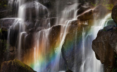 七彩飛瀑處在蜀南竹海石鼓山和石鑼山之間的葫蘆谷中,從深林里流出的水潦河,在回龍橋下分為四級(jí)瀉下懸崖,落差近200米,蔚為壯觀。晴天正午,日光下徹,可見彩虹生于潭底。站于其頭上,下為懸崖峭壁,只能聞其聲而不能睹其貌,故名“飛聲瀑”!∫渍婷鳌z