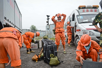 礦山救護(hù)隊(duì)隊(duì)員在進(jìn)行下井救援前的準(zhǔn)備工作(8月19日攝)! ⌒氯A社記者