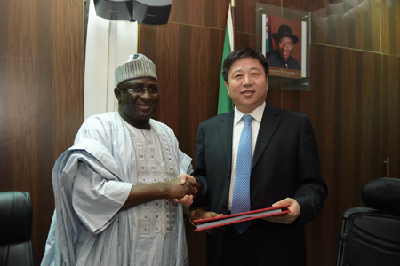 11月19日,中國鐵建中非建設(shè)有限公司在尼日利亞首都阿布賈與尼日利亞交通部正式簽署沿海鐵路項(xiàng)目商務(wù)合同,合同總金額119.7億美元。這是目前中國對外工程承包歷史上單體合同金額最大的項(xiàng)目!D為尼日利亞交通部部長奧馬爾(左)與中國鐵建中非建設(shè)有限公司副董事長曹保剛在簽約后握手。