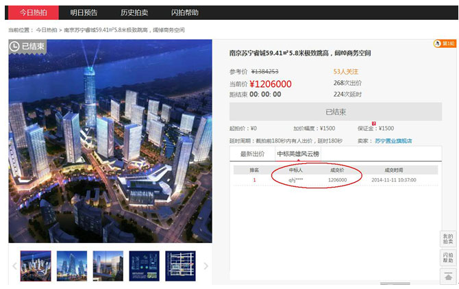 雙十一購物節(jié)如火如荼,正當(dāng)大家都在尋找最敗家的女人時(shí),在蘇寧第二屆O2O購物節(jié)上誕生了最“精明”的女人。11月11日10點(diǎn),家住南京市玄武的周女士經(jīng)過37分鐘的鏖戰(zhàn),最終用她老公的賬號(hào)在蘇寧閃拍頻道以120.6萬的出價(jià)拍得價(jià)值138.4萬元的南京蘇寧睿城商業(yè)用房,這比市場(chǎng)價(jià)低了近18萬元。