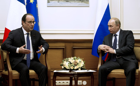 12月6日,在俄羅斯首都莫斯科,法國總統(tǒng)奧朗德(左)與俄羅斯總統(tǒng)普京舉行會談。雙方認(rèn)為緩解烏克蘭危機形勢十分重要,目前危機降級已具備條件。
