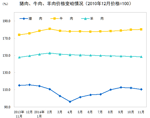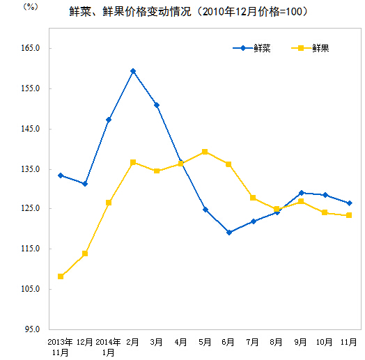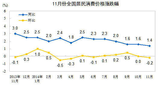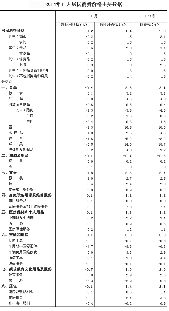 2014年11月份,全國居民消費(fèi)價(jià)格總水平同比上漲1.4%。其中,城市上漲1.5%,農(nóng)村上漲1.3%;食品價(jià)格上漲2.3%,非食品價(jià)格上漲1.0%;消費(fèi)品價(jià)格上漲1.3%,服務(wù)價(jià)格上漲1.8%。1-11月平均,全國居民消費(fèi)價(jià)格總水平比去年同期上漲2.0%。