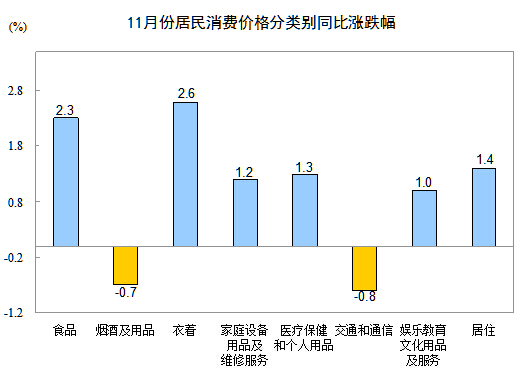 據(jù)測算,在11月份1.4%的居民消費(fèi)價(jià)格總水平同比漲幅中,去年價(jià)格上漲的翹尾因素約為0.3個(gè)百分點(diǎn),新漲價(jià)因素約為1.1個(gè)百分點(diǎn)。