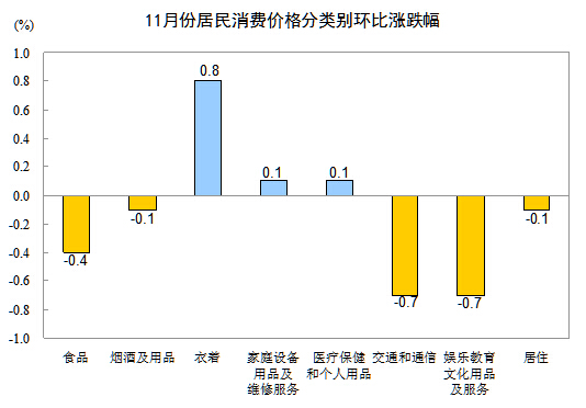11月份,全國居民消費(fèi)價(jià)格總水平環(huán)比下降0.2%。其中,城市下降0.2%,農(nóng)村下降0.2%;食品價(jià)格下降0.4%,非食品價(jià)格下降0.1%;消費(fèi)品價(jià)格下降0.2%,服務(wù)價(jià)格下降0.3%。