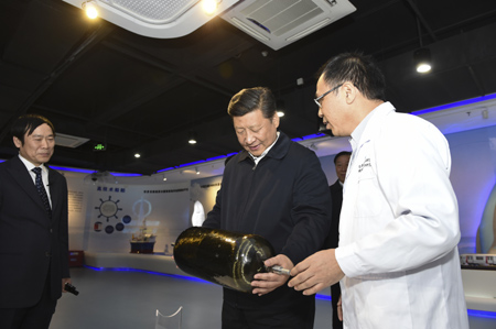 12月13日至14日,中共中央總書記、國家主席、中央軍委主席習(xí)近平在江蘇調(diào)研。習(xí)近平強(qiáng)調(diào),把經(jīng)濟(jì)發(fā)展抓好,關(guān)鍵還是轉(zhuǎn)方式、調(diào)結(jié)構(gòu),推動產(chǎn)業(yè)結(jié)構(gòu)加快由中低端向中高端邁進(jìn)。圖為13日,習(xí)近平在江蘇省產(chǎn)業(yè)技術(shù)研究院調(diào)研。