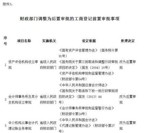 2014年12月20日消息,《國務(wù)院關(guān)于取消和調(diào)整一批行政審批項目等事項的決定》(國發(fā)〔2014〕27號)決定取消財政部“以折股方式繳納探礦權(quán)采礦權(quán)價款審批”事項,取消“注冊資產(chǎn)評估師”職業(yè)資格許可和認定事項;《國務(wù)院關(guān)于取消和調(diào)整一批行政審批項目等事項的決定》(國發(fā)〔2014〕50號)決定將省級人民政府財政部門實施的“資產(chǎn)評估機構(gòu)設(shè)立審批”、“會計師事務(wù)所及其分支機構(gòu)設(shè)立審批”、“中介機構(gòu)從事會計代理記賬業(yè)務(wù)審批”3項工商登記前置審批調(diào)整為后置審批。現(xiàn)予公布,請遵照執(zhí)行。