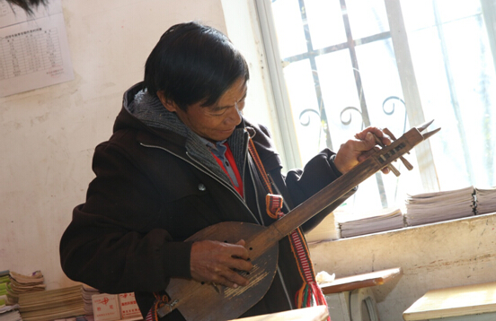 黝黑的膚色,一身灰藍(lán)色的棉布衣,帶著一頂具有民族特色的繡制帽子,身材略顯矮小但很結(jié)實(shí)的和盛偉透露出一種特別的“堅(jiān)韌”感。他在談起自己與四弦琴的特別緣分時(shí),很自然地拿出了自己的《殘疾證》,然后輕松地笑笑說(shuō):“我從小身體不方便,在十幾歲時(shí)開(kāi)始拿起了四弦琴,跟著我爸爸學(xué)了起來(lái),這讓我多了很多快樂(lè),也感覺(jué)有了很多希望。”