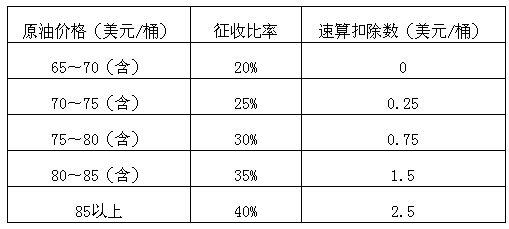 經(jīng)國務(wù)院批準(zhǔn),財(cái)政部決定從2015年1月1日起,將石油特別收益金起征點(diǎn)提高至65美元/桶。起征點(diǎn)提高后,石油特別收益金征收仍實(shí)行5級(jí)超額累進(jìn)從價(jià)定率計(jì)征。具體征收比率及速算扣除數(shù)見下表: