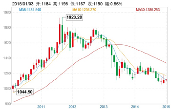 國(guó)際金價(jià)2013年結(jié)束長(zhǎng)達(dá)12年的連續(xù)漲勢(shì)大幅下挫27%,2014年則經(jīng)歷了價(jià)格的平穩(wěn)期,目前價(jià)格仍維持在一年前約每盎司1200美元的水平,是金融危機(jī)之后波動(dòng)幅度最小的一年。