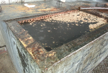 在中器環(huán)保的地溝油收集池中,臟臭的地溝油被集納起來等待處置,走進這個大廳,一股濃烈的異味撲面而。周琳/攝 |
