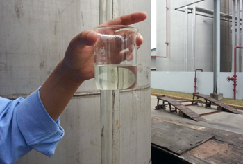 中器環(huán)保的工作人員向記者展示已加工好的生物柴油,顏色清澈,沒有特別的氣味。 周琳/攝 |