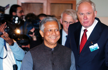 “實際上,我想踐行這樣一種機(jī)制,就是讓那些有能力的窮人得到這筆錢,通過某種方式,給他們貸款來幫助他們。而這樣的一種機(jī)制應(yīng)該說是‘放之四海而皆準(zhǔn)’的,無論是在孟加拉,在中國,在危地馬拉,還是在美國等等,都一樣!痹L談結(jié)束時,尤努斯這樣告訴記者。