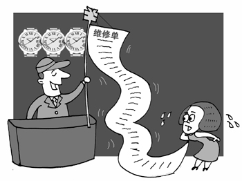 家住北京市朝陽區(qū)的王小姐2012年底在美國亞馬遜網(wǎng)上下單,購買了一塊卡地亞“藍(lán)氣球”鋼表,在使用了近兩年時間后,表帶上的穿釘開始變形甚至脫落,于是她來到了位于北京國貿(mào)的卡地亞專賣店,希望能就此問題進(jìn)行檢修。在王小姐看來,更換表帶穿釘是一項正常而簡單的產(chǎn)品維修,自己應(yīng)該用不了幾天就能將已經(jīng)換好新穿釘?shù)氖直砣』亍?BR> 然而讓王小姐沒想到的是,卡地亞方面幾天后向她發(fā)送了一張高達(dá)6474元人民幣的報價清單。該清單上顯示,經(jīng)卡地亞維修技師的評估,需要對腕表進(jìn)行全面保養(yǎng)服務(wù),包括拆卸腕表表殼、機(jī)芯快慢調(diào)整、受磁情況檢測并在必要時退磁、維修真乃或更換損壞的機(jī)芯組建并恢復(fù)機(jī)芯功能、更換所有的膠圈、以超聲波清潔表殼與金屬表鏈、重新組裝腕表、檢測機(jī)芯的動力儲能運作、防水性能測試等。此外,報價單中還列有更換全新表盤和表針的費用。