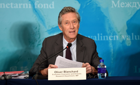 圖為當(dāng)日國(guó)際貨幣基金組織首席經(jīng)濟(jì)學(xué)家?jiàn)W利維耶·布朗夏爾介紹《世界經(jīng)濟(jì)展望報(bào)告》最新預(yù)測(cè)。