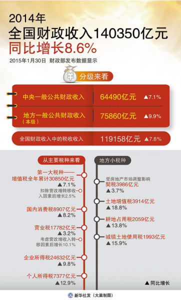 這一點(diǎn)表現(xiàn)很明顯,在稅收收入當(dāng)中,國內(nèi)增值稅是稅收項(xiàng)目里的“重頭”。受到去年工業(yè)生產(chǎn)增速放緩、工業(yè)生產(chǎn)者出廠價(jià)格下降等因素,2014年國內(nèi)增值稅為30850億元,同比增長7.1%,增幅偏低。